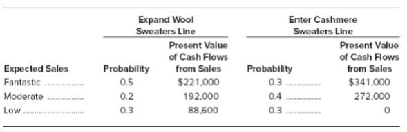Expand Wool Sweaters Line Enter Cashmere Sweaters Line Present Value Present Value of Cash Flows of Cash Flows Expected Sales Fantastic . - Probability from Sales Probability from Sales 0.5 $221,000 0.3 $341,000 Moderate 0.2 192,000 0.4 272,000 Lo ... 0.3 88,600 0.3