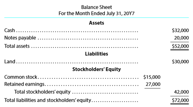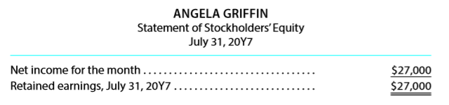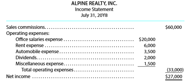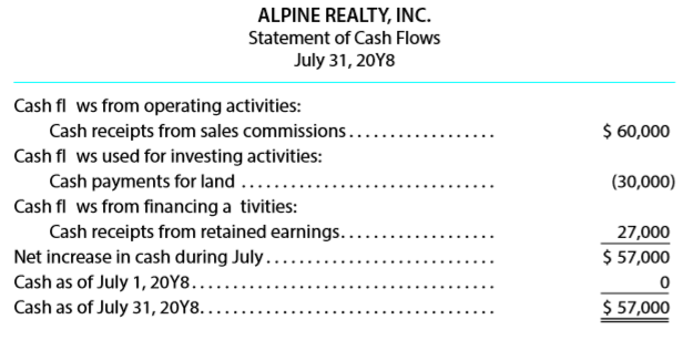 ALPINE REALTY, INC. Income Statement July 31, 20Y8 Sales commissions.... Operating expenses: Office salaries expense. $60,000 $20,000 Rent expense ... Automobile expense. Dividends....... Miscellaneous expense.. 6,000 3,500 2,000 1,500 Total operating expenses. (33,000) $27,000 Net income ..... ANGELA GRIFFIN Statement of Stockholders' Equity July 31, 20Y7 Net income for the month..... $27,000 $27,000 Retained earnings, July 31, 20Y7 . Balance Sheet For the Month Ended July 31, 20Y7 Assets Cash ..... $32,000 Notes payable 20,000 Total assets .... $52,000 Liabilities Land..... $30,000 Stockholders' Equity Common stock...... $15,000 Retained earnings... 27,000 Total stockholders'equity 42,000 Total liabilities and stockholders' equity.... $72,000 ALPINE REALTY, INC. Statement of Cash Flows July 31, 20Y8 Cash fl ws from operating activities: Cash receipts from sales commissions.... $ 60,000 Cash fl ws used for investing activities: Cash payments for land.... Cash fl ws from financing a tivities: Cash receipts from retained earnings... Net increase in cash during July...... Cash as of July 1, 20Y8.... Cash as of July 31, 20Y8... (30,000) 27,000 $ 57,000 $ 57,000