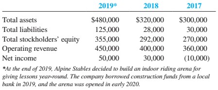 2019* 2018 2017 Total assets $480,000 $320,000 $300,000 Total liabilities 125,000 28,000 30,000 Total stockholders' equity Operating revenue 292,000 355,000 450,000 270,000 360,000 400,000 Net income 50,000 30,000 (10,000) *At the end of 2019, Alpine Stables decided to build an indoor riding arena for giving lessons year-round. The company borrowed construction funds from a local bank in 2019, and the arena was opened in early 2020.
