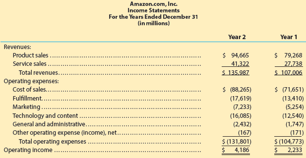 Amazon.com, Inc. Income Statements For the Years Ended December 31 (in millions) Year 2 Year 1 Revenues: Product sales. $ 94,665 $ 79,268 Service sales . 41,322 27,738 Total revenues.. Operating expenses: Cost of sales... $ 135.987 $ 107.006 $ (88,265) (17,619) $ (71,651) Fulfillment.. (13,410) Marketing.. Technology and content. (7,233) (5,254) (16,085) (12,540) General and administrative.. (2,432) (1,747) Other operating expense (income), net.. Total operating expenses (171) $ (104,773) (167) $ (131,801) Operating income $ 4,186 $ 2,233