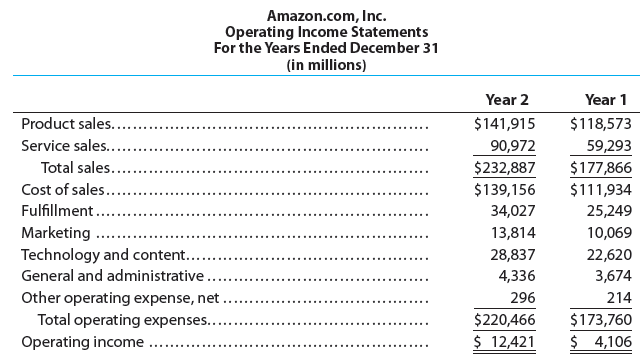 Amazon.com, Inc. is the largest Internet retailer in the United States. Amazonâs income statements through operating income for two recent years are as follows (in millions):