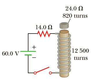 An 820-turn wire coil of resistance 24.0 Ω is placed on top of a 12 500-turn, 7.00-cm-long solenoid, as in Figure P20.57. Both coil and solenoid have cross-sectional areas of 1.00 x 10-4 m2.