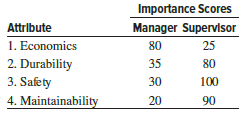 An airport Baggage Handing Department has evaluated two proposals for baggage delivery conveyor systems. A present worth analysis at i = 15% per year of estimated revenues and costs resulted in PWA = $460,000 and PWB = $395,000. In addition to this economic measure, three more attributes were independently assigned a relative importance score from 0 to 100 by the department manager and a senior team supervisor.