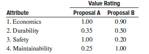 Separately, you have used the four attributes to value rate the two proposals on a scale of 0 to 1.0 as shown in the following table. (The economics attribute was rated using the PW values.)