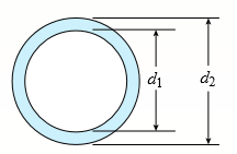 > An aluminum pipe column (alloy 2014-T6) with pinned ends has an outside diameter d2 = 5.60 in and inside diameter d1 = 4.80 in (see figure). Determine the allowable axial load Pallow for each of the following lengths: L = 6 ft, 8 ft, 10 ft, and 12 ft.
