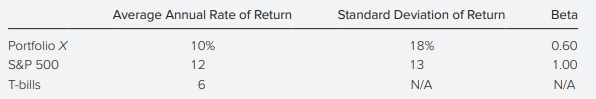 An analyst wants to evaluate portfolio X, consisting entirely of U.S. common stocks, using both the Treynor and Sharpe measures of portfolio performance. The following table provides the average annual rate of return for portfolio X, the market portfolio (as measured by the S&P 500), and U.S. Treasury bills during the past 8 years: