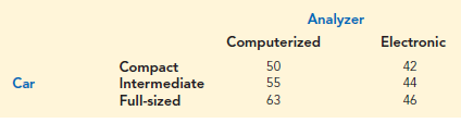 An automobile dealer conducted a test to determine if the time in minutes needed to complete a minor engine tune-up depends on whether a computerized engine analyzer or an electronic analyzer is used. Because tune-up time varies among compact, intermediate, and full-sized cars, the three types of cars were used as blocks in the experiment. The data obtained follow.