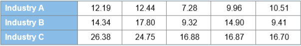 Industry A 12.19 12.44 7.28 9.96 10.51 Industry B 14.34 17.80 9.32 14.90 9.41 Industry C 26.38 24.75 16.88 16.87 16.70