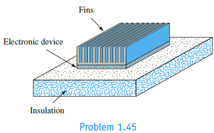 An electronic device that internally generates 600 mW of heat has a maximum permissible operating temperature of 70°C. It is to be cooled in 25°C air by attaching aluminum fins with a total surface area of 12 cm2. The convection heat transfer coefficient between the fins and the air is 20 W/m2 K. Estimate the operating temperature when the fins are attached in such a way that