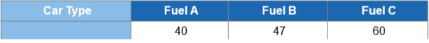 Fuel B Fuel C Car Type Fuel A 47 60 40 Нybrid I 36 43 50 43 41 52 48 46 49 Hybrid II 48 44 45 51 48 56 31 51 50 Hybrid II 41 43 42 47 38 50