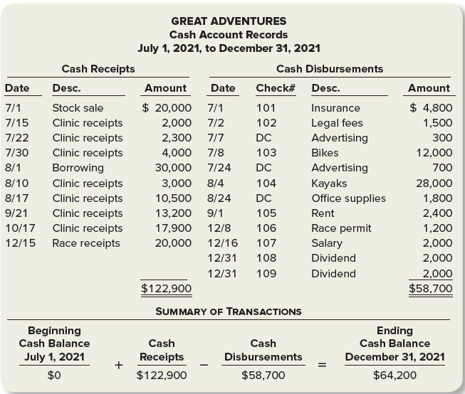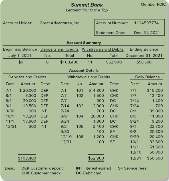 2. Prepare Great Adventuresâ bank reconciliation for the six-month period ended December 31, 2021, and any necessary entries to adjust cash.