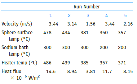 An experiment was conducted in which the heat transfer from a sphere in sodium was measured. The sphere, 0.5 in. in diameter, was pulled through a large sodium bath at a given velocity while an electrical heater inside the sphere maintained the temperature at a set point. The following table gives the results of the experiment. Determine how well the above data are predicted by the appropriate correlation given in the text. Express your results in terms of the per- cent difference between the experimentally deter- mined Nusselt number and that calculated from the equation.