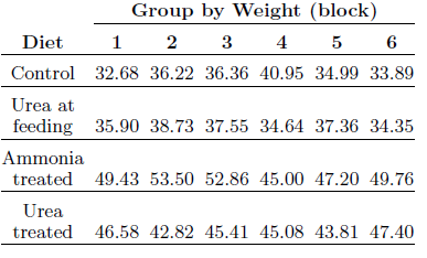 Group by Weight (block) Diet 1 2 3 4 5 Control 32.68 36.22 36.36 40.95 34.99 33.89 Urea at feeding 35.90 38.73 37.55 34.64 37.36 34.35 Ammonia treated 49.43 53.50 52.86 45.00 47.20 49.76 Urea treated 46.58 42.82 45.41 45.08 43.81 47.40