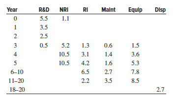 An international aerospace contractor has been asked by a municipal police department to estimate and analyze the life cycle costs for a proposed drone surveillance system to monitor traffic patterns and congestion within the central thoroughfares of the city. The list of items include the following general categories: R&D costs (R&D), nonrecurring investment costs (NRI), recurring investment costs (RI), scheduled and unscheduled maintenance costs (Maint), equipment usage costs (Equip), and disposal costs (Disp). The costs (in $ million units) for the 20-year life cycle have been estimated. Calculate the annual LCC at an interest rate of 7% per year.