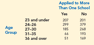 > Refer again to the data from the MBA new-matriculants survey in exercise 52. a. Given that a person applied to more than one school, what is the probability that the person is 24–26 years old? b. Given that a person is in the 36-and-ove