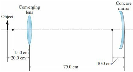 An object is placed 20.0 cm from a converging lens with focal length 15.0 cm (see the figure, not drawn to scale). A concave mirror with focal length 10.0 cm is located 75.0 cm to the right of the lens. Light goes through the lens, reflects from the mirror, and passes through the lens again, forming a final image.
