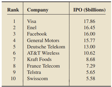 An online article from the Washington Post, titled “Facebook Joins Ranks of Largest IPOs in U.S. History,” gave the following information on the top 10 IPOs (initial public offerings) in the United States as of May 2012.