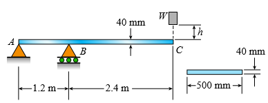 > An object of weight W is dropped onto the midpoint of a simple beam AB from a height h (see figure). The beam has a rectangular cross section of area A. Assuming that h is very large compared to the deflection of the beam when the weight W is applied sta