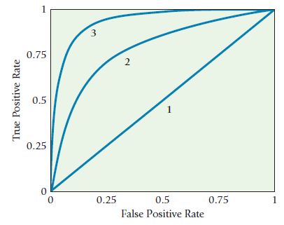 An ROC curve plots the false positive rate (x-axis) against the true positive rate (y-axis) for different model thresholds. The graph below shows three different ROC curves labeled 1, 2, and 3.