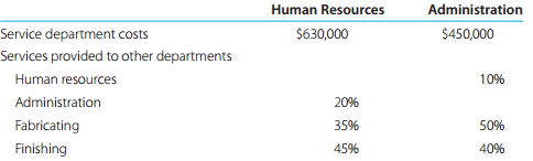 Human Resources Administration Service department costs $630,000 $450,000 Services provided to other departments Human resources 10% Administration 20% Fabricating 35% 50% Finishing 45% 40%