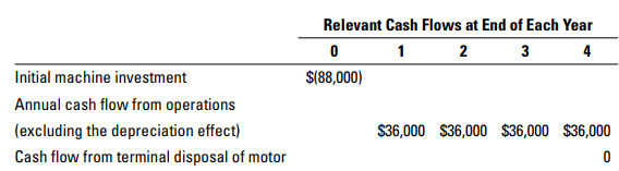 Relevant Cash Flows at End of Each Year 0 1 2 3 4 Initial machine investment $(88,000) Annual cash flow from operations (excluding the depreciation effect) $36,000 $36,000 $36,000 $36,000 Cash flow from terminal disposal of motor