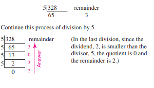 Note that the division continues until the quotient is zero. The answer is read from the bottom number to the top number in the remainder column. Thus, 328 = 23035.