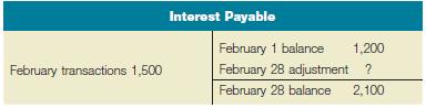 Interest Payable February 1 balance 1,200 February transactions 1,500 February 28 adjustment ? February 28 balance 2,100