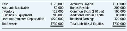 Cash Accounts Receivable Inventory Buildings & Equipment Less: Accumulated Depreciation $ 75,000 50,000 125,000 700,000 (220,000) $730,000 Accounts Payable Bonds Payable Common Stock ($10 par) Additional Paid-In Capital Retained Earnings $ 30,000 200,000 100,000 80,000 320,000 Total Assets Total Liabilities & Equities $730,000