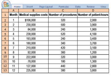 Apollo Hospital specializes in outpatient surgeries for relatively minor procedures. Apollo is a nonprofit institution and places great emphasis on controlling costs in order to provide services to the community in an efficient manner. Apolloâs CFO, Julie Chen, has been concerned of late about the hospitalâs consumption of medical supplies. To better understand the behavior of this cost, Julie consults with Rhett Bratt, the person responsible for Apolloâs cost system. After some discussion, Julie and Rhett conclude that there are two potential cost drivers for the hospitalâs medical supplies costs. The first driver is the total number of procedures performed. The second is the number of patient-hours generated by Apollo. Julie and Rhett view the latter as a potentially better cost driver because the hospital does perform a variety of procedures, some more complex than others. Rhett provides the following data relating to the past year to Julie.