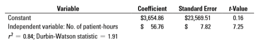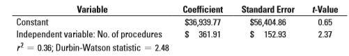 Home Insert B Page Layout Formulas Data Review View A C D 1 Month Medical supplies costs Number of procedures Number of patient-hours 1 $106,000 320 2,000 3,900 1,900 2 230,000 500 3 240 84,000 238,000 193,000 4 4 520 4,100 6 240 3,400 3,700 3,100 1,200 3,000 1,300 7 6 180,000 340 8 7 210,000 420 8 92,000 360 10 9 222,000 78,000 320 11 10 180 12 11 127,000 225,000 440 2,800 3,800 13 12 380 Variable Coefficient Standard Error tValue Constant Independent variable: No. of procedures p? = 0.36; Durbin-Watson statistic = 2.48 $36,939.77 $ 361.91 $56,404.86 $ 152.93 0.65 2.37 Variable Coefficient Standard Error tValue Constant $3,654.86 $23,569.51 0.16 Independent variable: No. of patient-hours $ 56.76 7.82 7.25 p? = 0.84; Durbin-Watson statistic 1.91