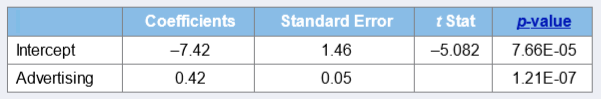 Coefficients Standard Error t Stat p-value Intercept -7.42 1.46 -5.082 7.66E-05 Advertising 0.42 0.05 1.21E-07