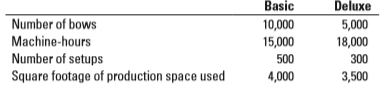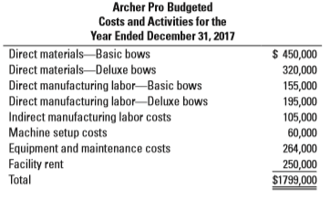 Archer Pro Budgeted Costs and Activities for the Year Ended December 31, 2017 Direct materials–Basic bows $ 450,000 320,000 Direct materials-Deluxe bows Direct manufacturing labor-Basic bows Direct manufacturing labor-Deluxe bows Indirect manufacturing labor costs Machine setup costs Equipment and maintenance costs Facility rent Total 155,000 195,000 105,000 60,000 264,000 250,000 $1799,000 Basic Deluxe Number of bows 10,000 5,000 Machine-hours 15,000 18,000 Number of setups Square footage of production space used 500 300 4,000 3,500