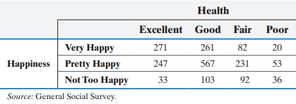 Are health and happiness related? The following data represent the level of happiness and level of health for a random sample of individuals from the General Social Survey.
