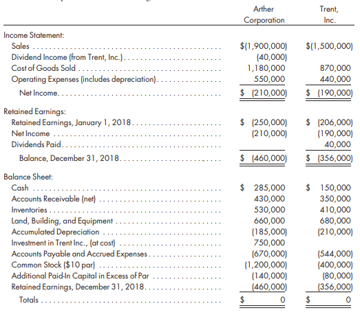 Arther Trent, Corporation Inc. Income Statement: Sales $(1,900,000) (40,000) 1,180,000 550,000 $(1,500,000) Dividend Income (from Trent, Inc.). Cost of Goods Sold . 870,000 440,000 Operating Expenses (includes depreciation). Net Income.. $ (210,000) $ (190,000) Retained Earnings: Retained Earnings, January 1, 2018. $ (250,000) (210,000) $ (206,000) (190,000) 40,000 $ (356,000) Net Income Dividends Paid. Balance, December 31, 2018. $ (460,000) Balance Sheet: $ 285,000 $ 150,000 350,000 410,000 680,000 Cash Accounts Receivable (net) 430,000 530,000 660,000 Inventories. Land, Building, and Equipment Accumulated depreciation Investment in Trent Inc., (at cost) Accounts Payable and Accrued Expenses. Common Stock ($10 par) Additional Paid-In Capital in Excess of Par Retained Earnings, December 31, 2018. (185,000) 750,000 (210,000) (670,000) (1,200,000) (140,000) (544,000) (400,000) (80,000) (356,000) (460,000) Totals %24 24