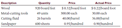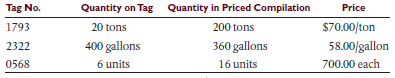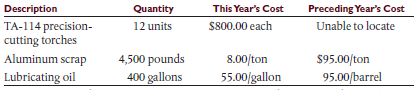 Description Quantity Price Actual Price Wood 920 board feet $0.32/board foot $0.22/board foot 300.00 each Metal-cutting tools Cutting fluid Sandpaper 49 units 30.00 each 26 barrels 40.00/barrel 36.00/barrel 600 sheets 0.95/hundred 0.90/hundred Description Quantity This Year's Cost Preceding Year's Cost TA-114 precision- cutting torches 12 units $800.00 each Unable to locate Aluminum scrap 4,500 pounds 8.00/ton $95.00/ton Lubricating oil 400 gallons 55.00/gallon 95.00/barrel Tag No. Quantity on Tag Quantity in Priced Compilation Price 1793 20 tons 200 tons $70.00/ton 400 gallons 360 gallons 58.00/gallon 2322 0568 6 units 16 units 700.00 each