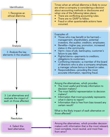 Times when an ethical dilemma is likely to occur are when a company is considering a decision about accounting methods or disclosures and when one of the following takes place: • There are oonflicting accounting rules. There are no GAAP to follow. • Fraud or other questionable actions have occurred. Identification 1. Recognize an ethical dilemma. Examples of: • Those who may benefit or be harmed- management, shareholders, potential investors, the auditor, creditors, employees. • Benefits-higher pay, promotion, increased status in the community. • Harm-loss of job, bankruptcy, customer's failure to pay debt. • Rights/claims--payments to creditors, obligations to customers. • Conflicting interests-a member of the board of directors who is also a company employee, a manager whose bonus is based on sales. • Responsibilities-providing the most accurate information, reporting fraud. Analysis 2. Analyze the key elements in the situation. Among the alternatives, which provides: The most useful and timely information to decision makers? The most faithful representation to decision makers? Information that most accurately represents what it claims to report? • Information that is free from bias toward any certain result? 3. List alternatives and evaluate the impact of each on those affected. What is the likely impact of each alternative on those affected? Resolution 4. Select the best alternative. Among the alternatives, which provides decision makers with information that is the most relevant, most complete, most neutral, and most free from error?