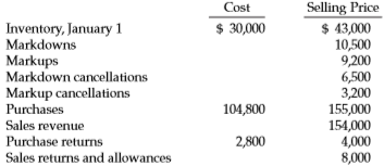 Selling Price $ 43,000 10,500 9,200 6,500 3,200 155,000 154,000 4,000 8,000 Cost $ 30,000 Inventory, January 1 Markdowns Markups Markdown cancellations Markup cancellations Purchases 104,800 Sales revenue Purchase returns 2,800 Sales returns and allowances