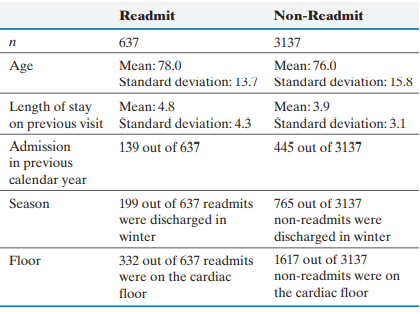 As of October 1, 2012, hospitals in the United States with excessive numbers of readmissions based on the Centers for Medicare and Medicaid Services (CMS) data were penalized. Therefore, it is important for hospitals to identify the risk factors associated with readmission. The following data represent statistics on patients readmitted within 30 days and those not readmitted within 30 days of being discharged at a community hospital. Conduct the appropriate test for each variable that might be associated with readmission (age, length of stay, and so on). Researchers wonder if: