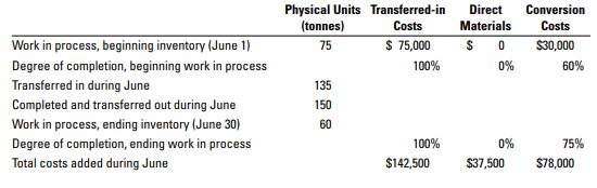 Physical Units Transferred-in (tonnes) Direct Conversion Costs Materials Costs Work in process, beginning inventory (June 1) 75 $ 75,000 $ 0 $30,000 Degree of completion, beginning work in process 100% 0% 60% Transferred in during June Completed and transferred out during June 135 150 Work in process, ending inventory (June 30) 60 Degree of completion, ending work in process 100% 0% 75% Total costs added during June $142,500 $37,500 S78,000