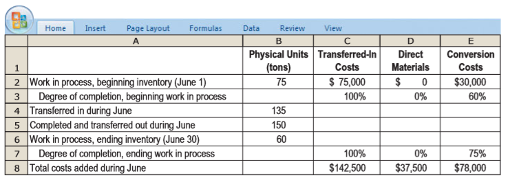Home Insert Page Layout Formulas Data Review View A Physical Units Transferred-In (tons) Direct Conversion 1. Costs Materials Costs $ 0 2 Work in process, beginning inventory (June 1) Degree of completion, beginning work in process 4 Transferred in during June 5 Completed and transferred out during June 6 Work in process, ending inventory (June 30) Degree of completion, ending work in process 8 Total costs added during June 75 $ 75,000 $30,000 3 100% 0% 60% 135 150 60 7 100% 0% 75% $142,500 $37,500 $78,000