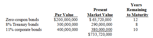 Ash expects that in four years, investors in the market will require an 8 percent return on the zero-coupon bonds, a 7 percent return on the Treasury bonds, and a 9 percent return on corporate bonds. Estimate the market value of the bond portfolio four years from now.