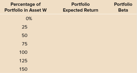 Percentage of Portfolio Portfolio Portfolio in Asset W Expected Return Beta 0% 25 50 75 100 125 150