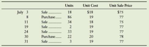 Units Unit Cost Unit Sale Price July 3 Sale 18 $18 $75 8 Purchase. 86 19 77 11 Sale 34 18 75 19 Sale 2 33 19 77 24 Sale 19 20 77 30 Purchase. 22 ..... 78 31 Sale 19 77 ........