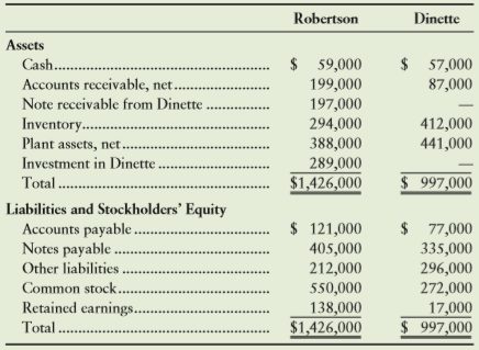 Assume Robertson, Inc., paid $289,000 to acquire all the common stock of Dinette Corporation and Dinette owes Robertson $197,000 on a note payable. Immediately after the purchase on September 30, 2016, the two companiesâ balance sheets are as follows: