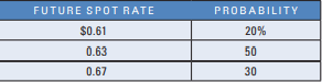 Assume that Carbondale Co. expects to receive S$500,000 in one year. The existing spot rate of the Singapore dollar is $0.60. The one-year forward rate of the Singapore dollar is $0.62. Carbondale created the following probability distribution for the future spot rate in one year:
