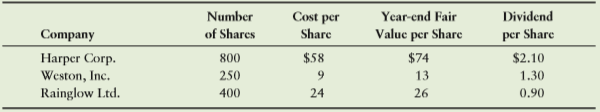 Number Cost per Year-end Fair Dividend Company of Shares Share Valuc per Share per Share Harper Corp. 800 $58 $74 $2.10 Weston, Inc. 250 13 1.30 Rainglow Ltd. 400 24 26 0.90