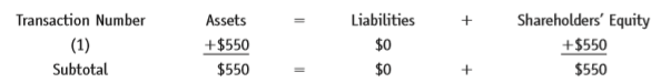 Transaction Number Assets Liabilities Shareholders' Equity (1) +$550 $0 +$550 Subtotal $550 $0 $550