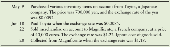 May 9 Purchascd various inventory items on account from Toyita, a Japancse company. The price was 700,000 yen, and the exchange rate of the yen was $0.0092. Paid Toyita when the exchange rate was $0.0085. Sold merchandisc on account to Magnificente, a French company, at a price of 40,000 euros. The exchange rate was $1.22. Ignore cost of goods sold. Collected from Magnificente when the exchange rate was $1.18. Jun 18 22 28