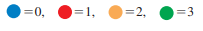 > Assume the numerals given are in a base 4 numeration system. In this system, suppose colors are used as numerals, as indicated below. Add the following base 4 numerals. Your answers will contain a variety of the colors indicated.