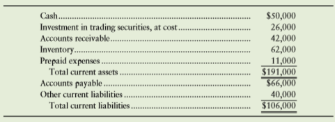 $50,000 26,000 42,000 62,000 11,000 $191,000 $66,000 40,000 $106,000 Cash.. Investment in trading securities, at cost. Accounts receivable. Inventory... Prepaid expenses. Total current assets. Accounts payable . Other current liabilities Total current liabilities
